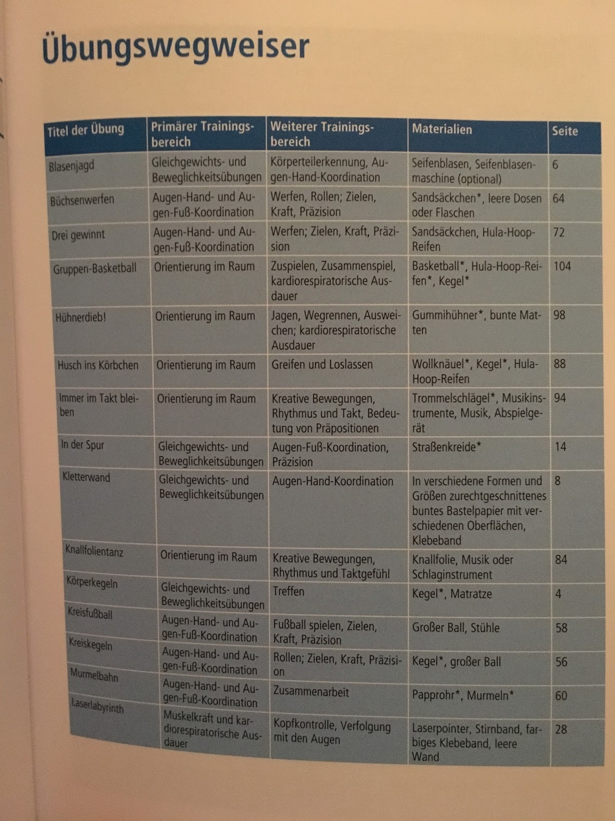 Vom Übungsweiser bin ich nicht nur restlos begeistert, sondern auch absolut überzeugt. Der Übungsweiser bietet nicht nur den Namen der entsprechenden Übung, sondern gibt auch noch Auskunft über den Primären Trainingsbereich, weitere Trainingsbereiche, die benötigten Materialien und die Seite, auf der die entsprechende Übung zu finden ist.