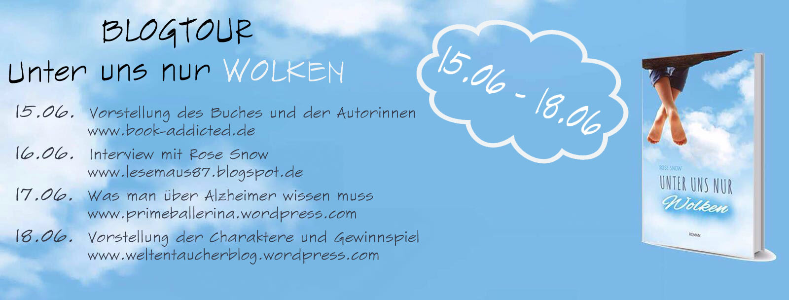 leider bin ich momentan nicht ganz so fit, weswegen ihr nicht ganz soviel von mir hört. Dennoch möchte ich euch eine Ankündigung machen: Morgen startet hier auf meinem Blog die Tour zu Rose Snow’s neuestem Roman „Unter uns nur Wolken“. Sie wird über 4 Stationen gehen und am Ende findet ihr ein Gewinnspiel! 🙂 Schaut doch mal vorbei!
