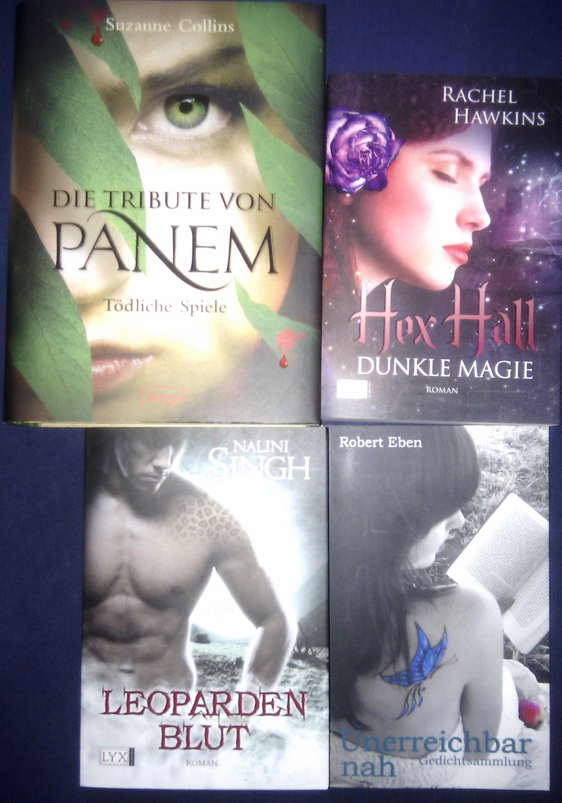 Die Tribute von Panem musste ich mir jetzt einfach mal zulegen: Soviele Rezi’s, so viele begeisterte Leser.. es wurde einfach Zeit! 😀 Hex Hall 02 war auch ein muss, auch wenn Band 1 immernoch ungelesen auf meinem SuB liegt 😀 Nalini Singh’s Leopardenblut hat mich einfach so angelacht und nachdem ich ihren Schreibstil aus den „Gilde der Jäger“ Büchern doch sehr gut fand, wanderte dies nun auch in mein Regal. Besonders zu Empfehlen: Unerreichbar nah, ein Gedichtband von Robert Eben – auf ihn wurde ich durch Lovelybooks aufmerksam 🙂